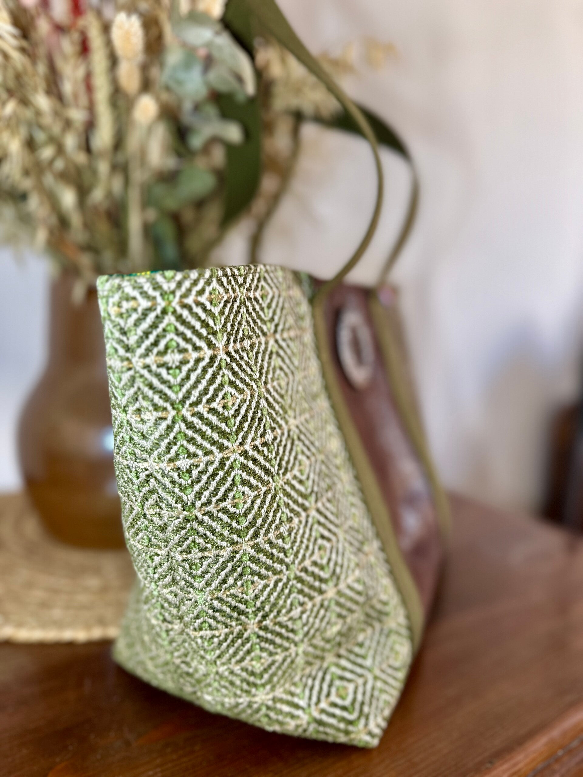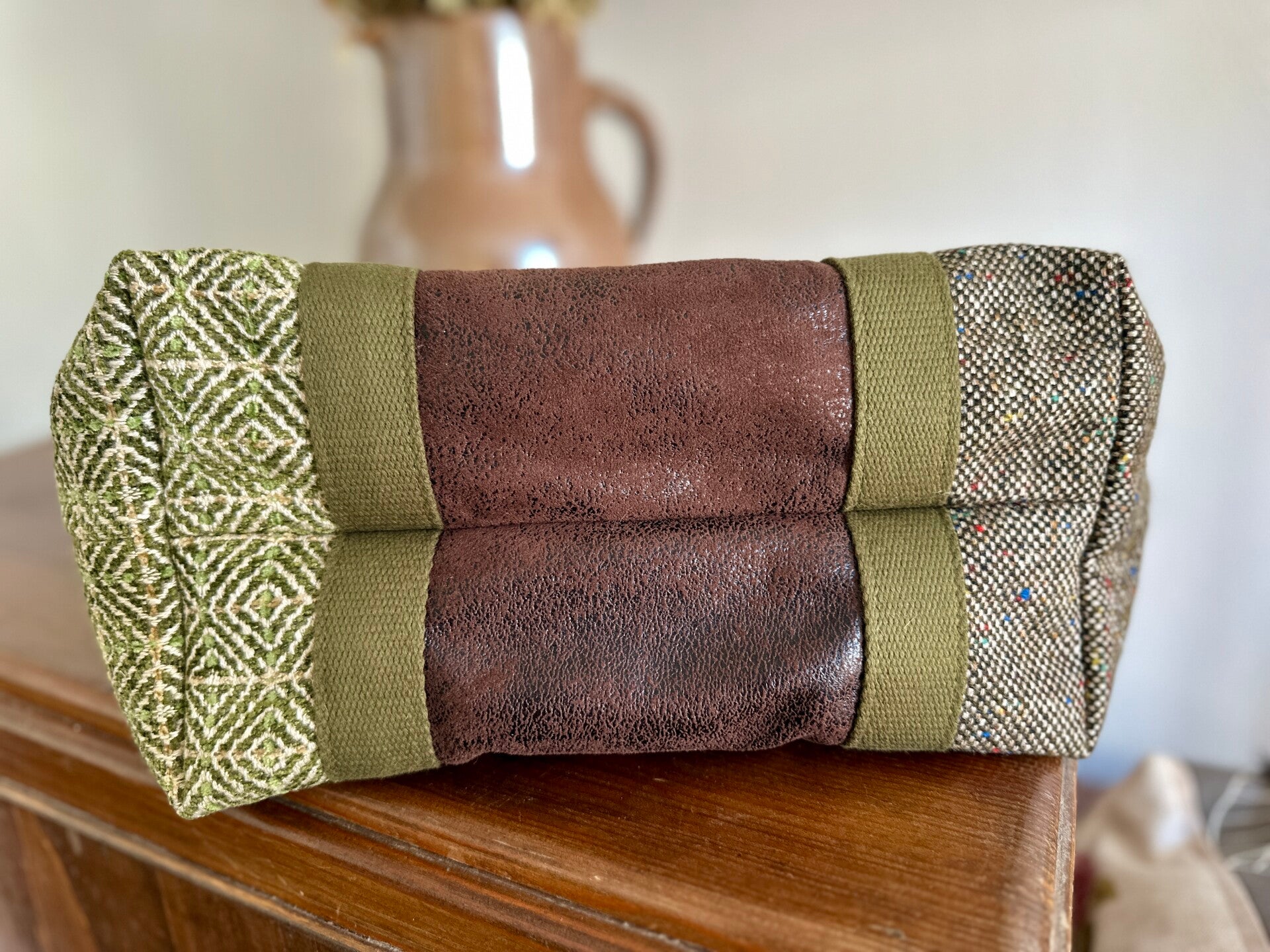 Sac réalisé à partir de fins de stock de lainage, d'une chute de simili cuir et d'un chemisier.