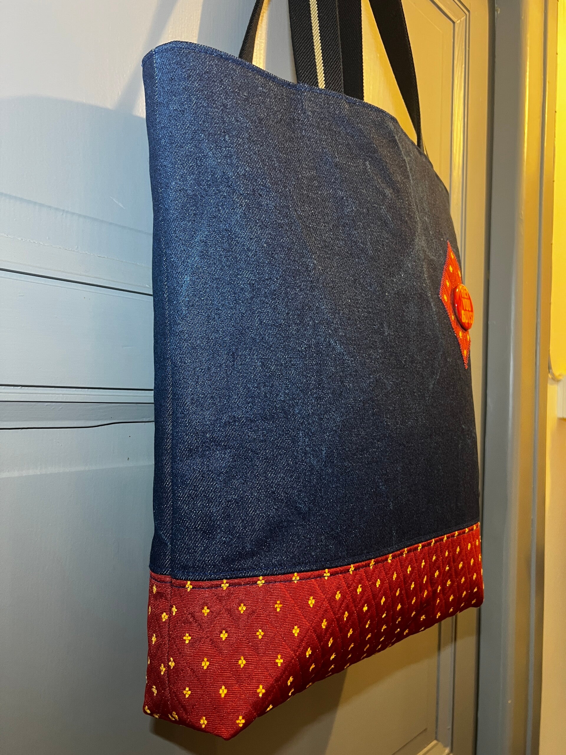 Tote bag robuste réalisé à partir d'un jeans et de deux chutes de tissu à tapisser.